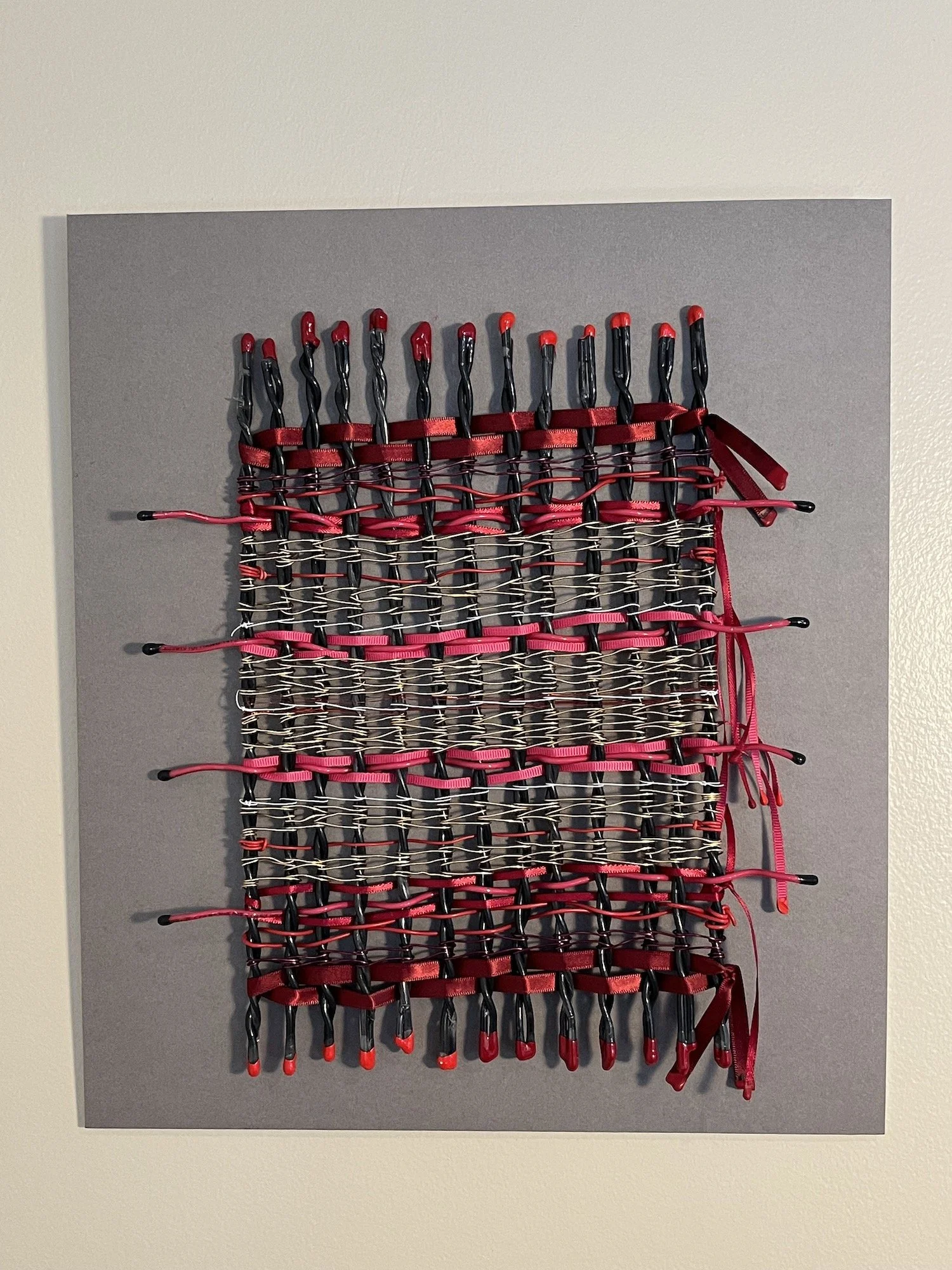 SCULPTURE / 2022Stained Red.2022Various metal wire/ribbon and wax Mounted on mat board12” x 10.5” View fullsize
