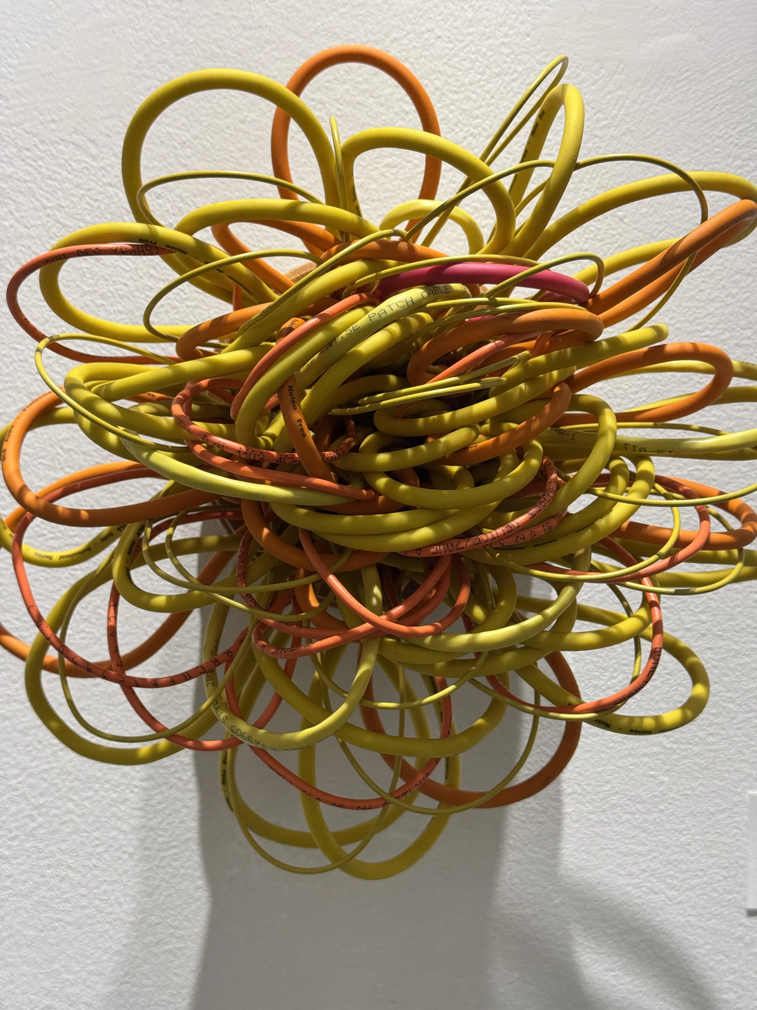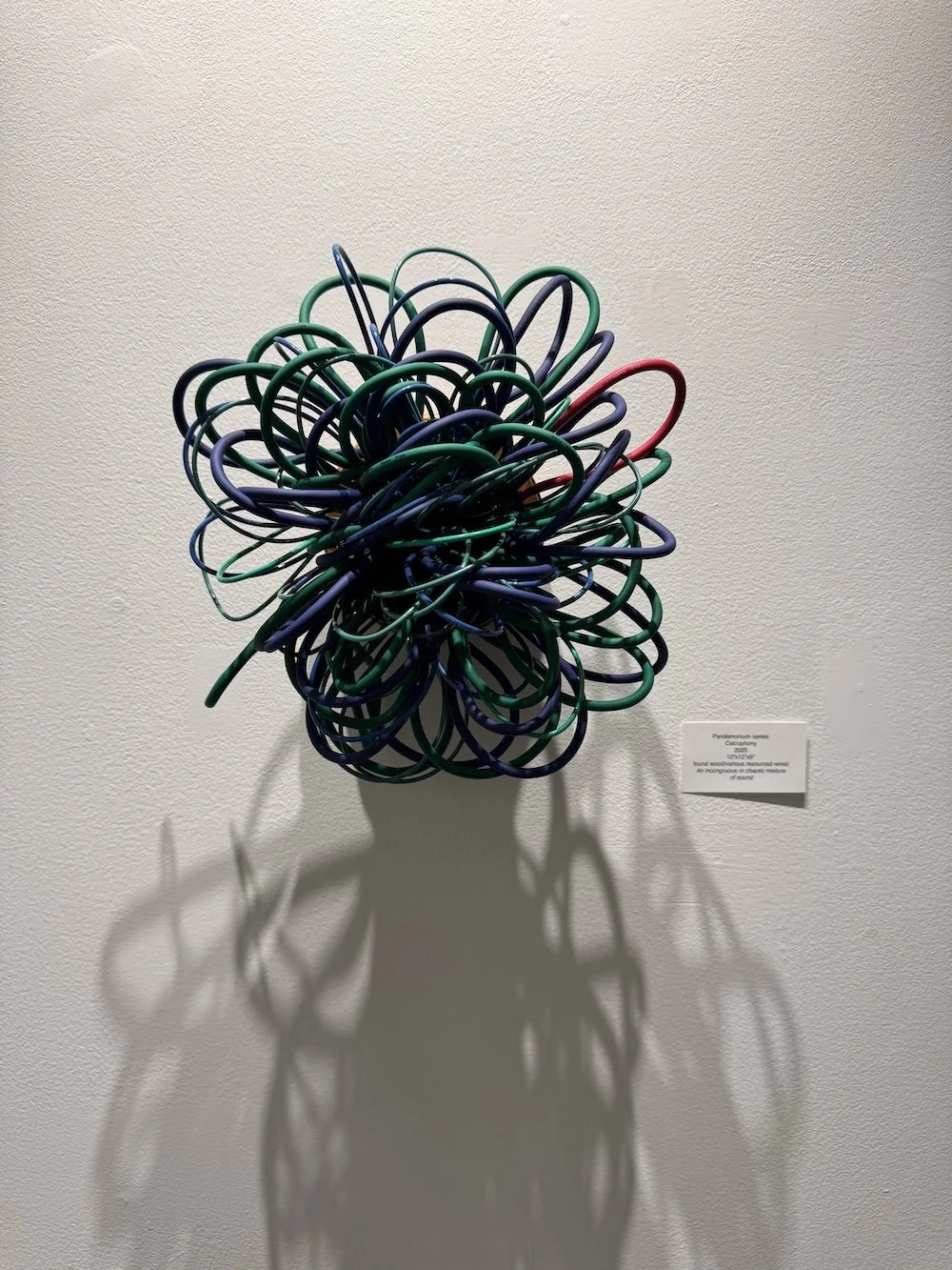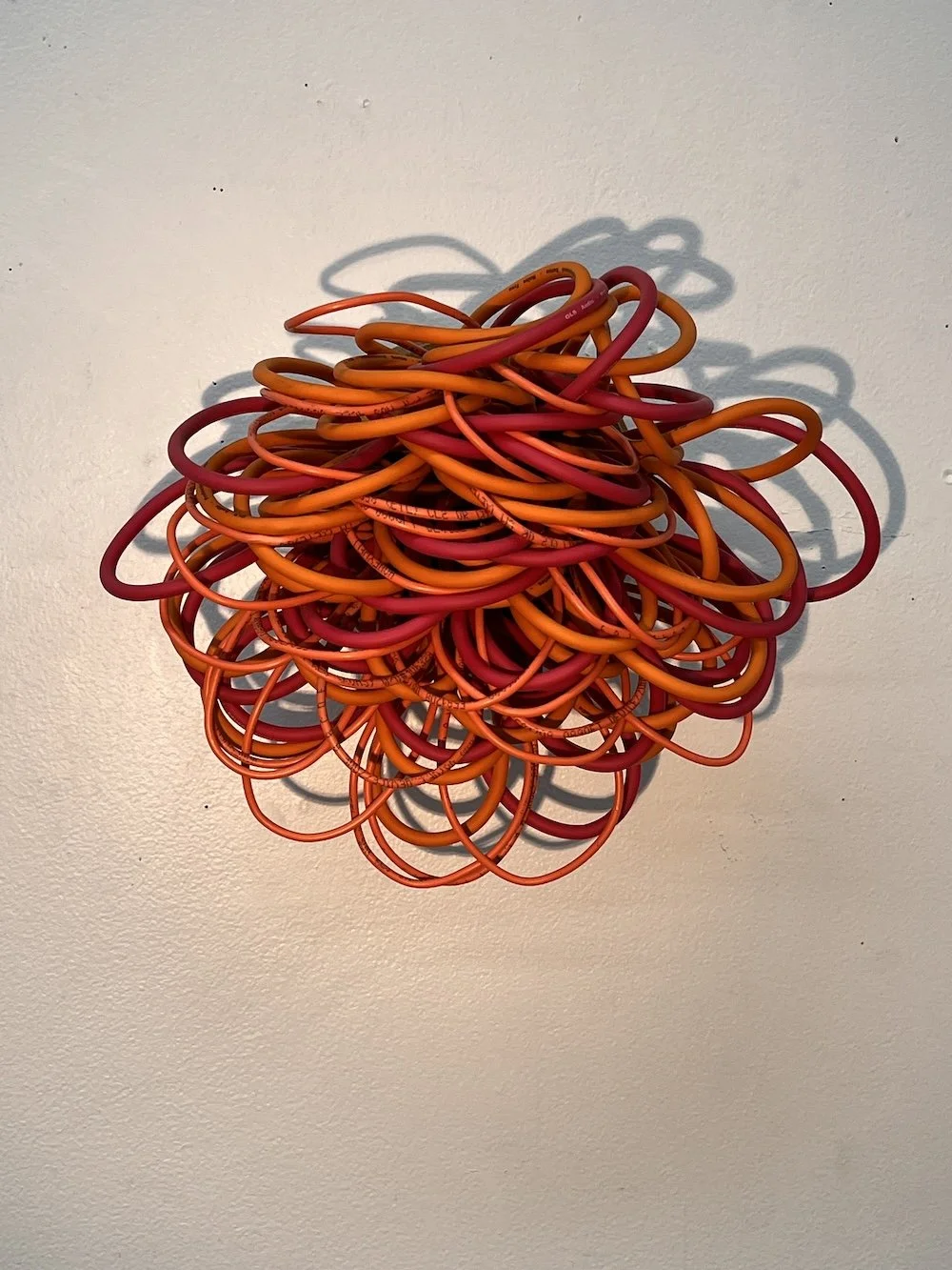 Little's manipulated household objects become arresting (Dys)function-al objects. She has woven wires blending tight form and chaos into artworks full of vibrancy and tension. In others she has interpreted needlepoint with wood, wire and wax with reference to tasks women held historically. The constant repetition of thousands of small actions, her work demands, it echo's the daily grind of housewives repeating mundane household tasks.
